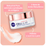 O Creme Facial Antissinais Nivea Cellular Expert Lift Avançado Dia FPS30 50ml é um hidratante com ação antissinais pensado para cuidar da pele madura ou que começa a mostrar sinais de envelhecimento. Sua textura cremosa e de rápida absorção promove hidratação profunda e conforto imediato, deixando a pele suave e com toque aveludado desde a primeira aplicação. Com ativos eficazes voltados para firmeza e elasticidade, ele ajuda a suavizar linhas finas e rugas, promovendo um aspecto mais jovem e descansado à pele.