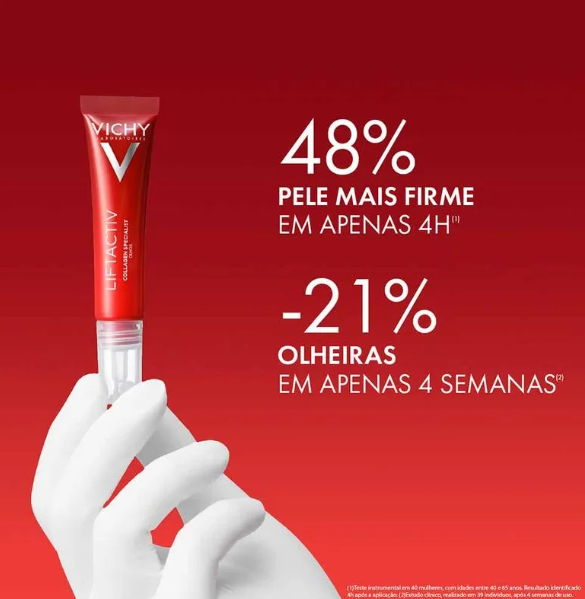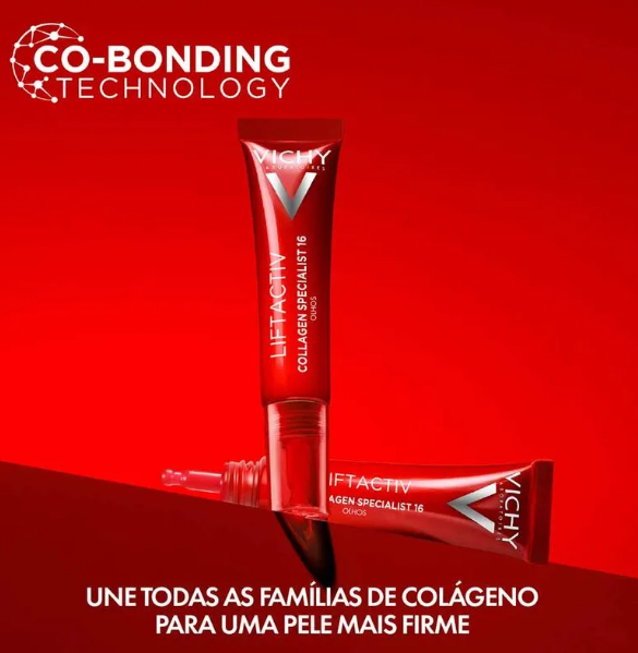 O Creme para Contorno dos Olhos Vichy Liftactiv Colágeno Specialist 16 15 ml age na região delicada ao redor dos olhos estimulando a produção de colágeno e ajudando a suavizar sinais visíveis de envelhecimento. A textura leve e de rápida absorção penetra facilmente sem deixar a pele oleosa ou pegajosa, trazendo conforto e sensação de frescor. Com o uso regular manhã e noite, o produto contribui para melhorar firmeza, elasticidade e textura da pele, reduzindo linhas finas, rugas, olheiras e inchaço — além de ajudar a uniformizar o tom e devolver viço ao olhar.