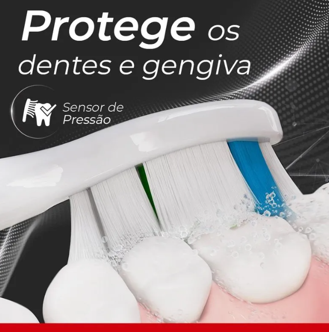 O modelo conta com 3 modos de uso — Limpeza, Branqueamento e Cuidado com a Gengiva — permitindo personalizar a escovação de acordo com a necessidade do dia. Seu sensor de pressão ajuda a proteger as gengivas, avisando quando a força aplicada está acima do ideal, enquanto o temporizador inteligente de 2 minutos e os alertas a cada 30 segundos facilitam a higienização equilibrada de todas as áreas da boca.