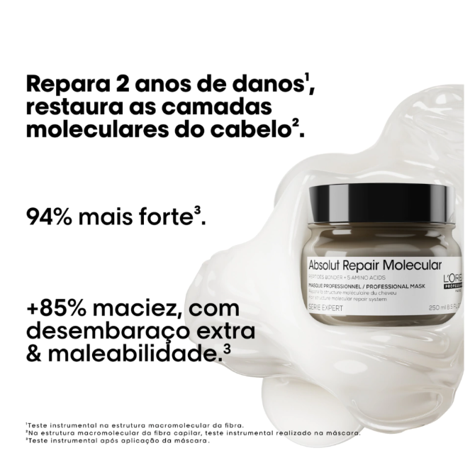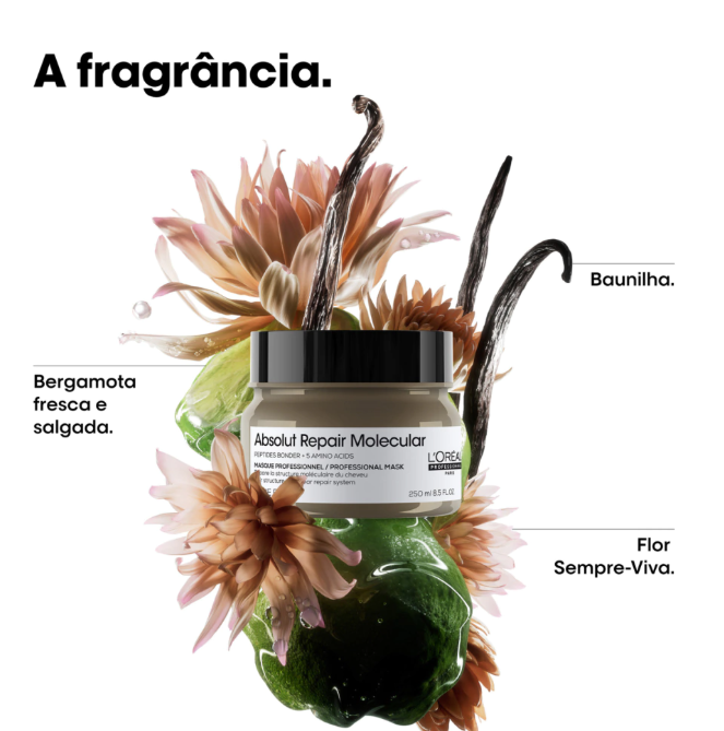 A Máscara Capilar L’Oréal Professionnel Absolut Repair Molecular 250ml é uma máscara de cuidado intensivo desenvolvido para recuperar profundamente cabelos danificados, frágeis ou sensibilizados por química, calor ou desgaste. Sua fórmula reconstrói a fibra capilar desde o interior, restaurando a estrutura e devolvendo resistência, elasticidade e vitalidade aos fios. Com textura cremosa e rica, ela penetra na fibra sem deixar peso, promovendo maciez imediata, toque sedoso e brilho natural. O uso contínuo fortalece os fios, diminui a quebra e melhora o aspecto geral, resultando em cabelos com aparência saudável, maleáveis e com movimento natural.